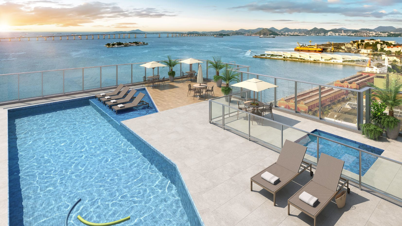 São unidades Studio, 1, 2 e 3 Quartos com varanda, opção de suíte e vaga além da vista eterna, debruçada para a Baía de Guanabara. Tudo no mais alto padrão de qualidade. Vista Incrível: Acorde todos os dias com a vista eterna da Baía de Guanabara. É cada vez mais raro encontrar um apartamento no Porto Maravilha, com a vista indevassável da Baía de Guanabara.